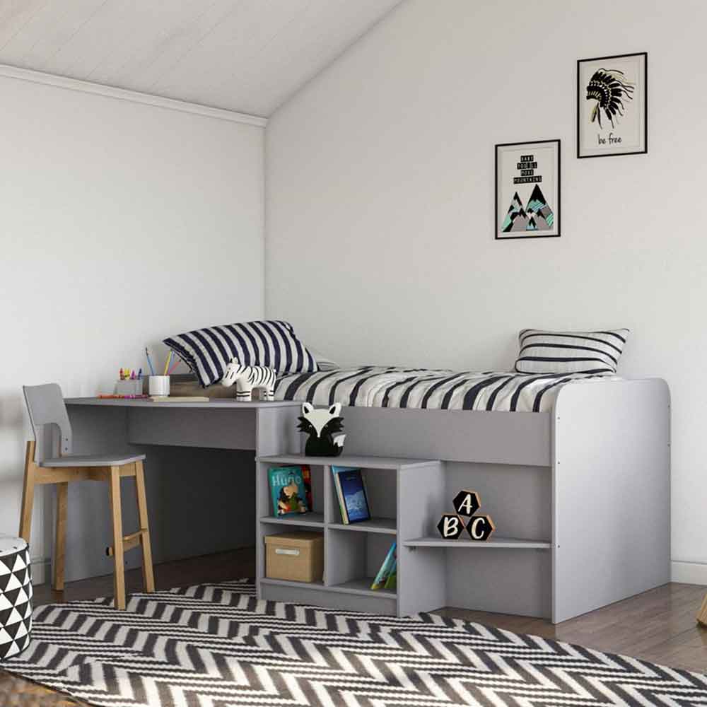 Transform your childs bedroom into a fun, functional and space-saving haven with the Furniture in Fashion Feltner Wooden Kids Cabin Bed In Grey. This cleverly designed cabin bed offers much more than a place to sleep it combines a comfortable sleeping area, study desk, and handy book storage in one stylish unit. Finished in a versatile grey tone, this cabin bed effortlessly complements most bedroom dcor while maximising usable space for play, rest, and study. Crafted with busy families in mind, the Feltner cabin beds low-to-the-ground design ensures easy access for children of different ages, and the durable wipe-clean finish makes everyday maintenance simple. Built with sturdy construction and clever storage solutions, this grey cabin bed is ideal for bedrooms where space-saving and multi-functionality matter. FEATURES : Material : Wooden Finish : Grey Mattress not included Combines a sleeping area, desk, and built-in bookcase to make the most of bedroom space Neutral wood-effect finish complements contemporary and classic kids room themes Easy and safe for children of various ages to climb in and out Provides a dedicated area for homework, crafts, reading, or play Keeps books, toys, and essentials organised and within reach Easy to maintain and perfect for busy family use Enhances durability and strength for long-lasting performance Great choice for smaller bedrooms or multifunctional spaces Available at an affordable price Images shown are for illustration purpose only DIMENSIONS : Height : 80cm Width : 137cm Depth : 195cm