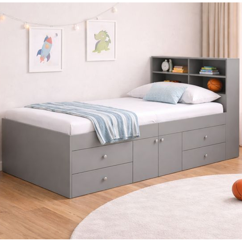 Maximise both sleep space and storage in your childs bedroom with the Furniture in Fashion Mattoon Wooden Single Cabin Bed in Grey. This modern cabin bed combines a cosy single sleeping area with built in storage compartments and an extended bookcase headboard, perfect for children who need extra space to store toys, books and bedtime essentials. Its contemporary grey finish brings a sophisticated yet playful look to kids rooms, blending effortlessly with most dcor styles. Designed to be both practical and stylish, the Mattoon Wooden Cabin Bed is ideal for growing kids aged approximately 6 years and above. With three underbed storage zones and additional cubby holes in the headboard, its a smart solution that keeps bedrooms tidy without compromising on comfort. Easy to assemble at home with clear instructions included, this grey cabin bed is built to last and makes everyday organisation easier for families. FEATURES : Material : Wooden Finish : Grey Mattress not included Stylish grey colour enhances modern bedrooms and complements a variety of interior themes Three underbed storage areas (two open sections plus a central cupboard) help keep clothes, toys and accessories organised Integrated headboard with four cubby holes provides additional storage or display space for books and dcor Combines sleep and storage in one unit ideal for smaller bedrooms or multiuse spaces Made from quality materials for everyday use and reliable performance Lower profile design makes access easy for children and adds safety and comfort Suitable for children aged 6 years and up, offering growingwithage utility Functional storage and headboard design create a tidy, stylish room look Available at an affordable price Images shown are for illustration purpose only DIMENSIONS : Height : 100cm Length : 214cm Depth : 96cm